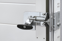 Оригинальное запирающее устройство Hörmann (арт. 3061875) предназначено для дополнительной фиксации гаражных секционных ворот изнутри помещения. Позволяет надежно запереть ворота вручную, обеспечивая дополнительную защиту или фиксацию при отключении автоматики.